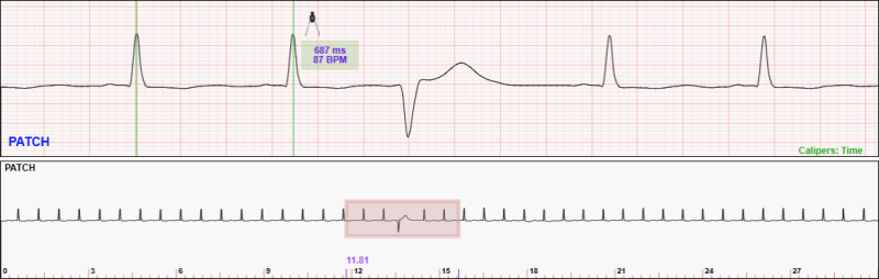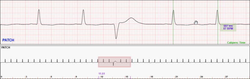 To measure a different region of the ECG when a Time Caliper Measurement is already present, repeat the steps outlined above but start the measurement outside the boundaries of the existing one.