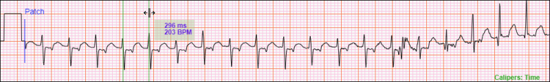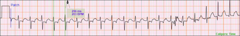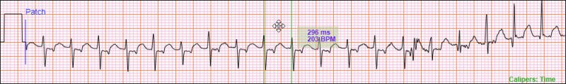 You can move a Time Caliper Measurement around the ECG in the Analysis Window. For example, if you want to check if the RR interval between the third and fourth normal QRS complexes in the image below is the same as the first RR interval, you can move the Time Caliper Measurement by placing the mouse cursor between the two measurement lines. The mouse cursor will change to