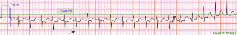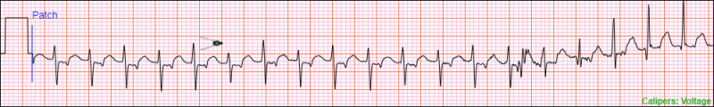 To use the Voltage Caliper, move the top arm of the caliper cursor to the desired start location. Press and hold the left mouse button and move the mouse up or down to begin measuring. A Voltage Caliper Measurement consisting of two caliper lines and a measurement box will appear on the ECG as you move the mouse. When you reach the desired end location, release the left mouse button. The Voltage Caliper Measurement will remain on the ECG.