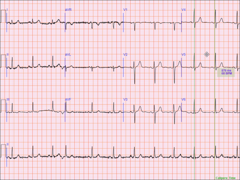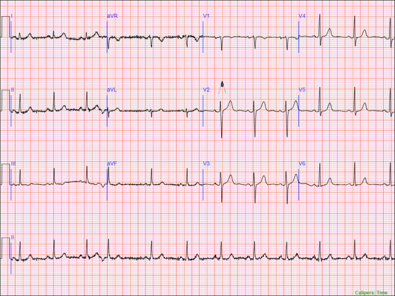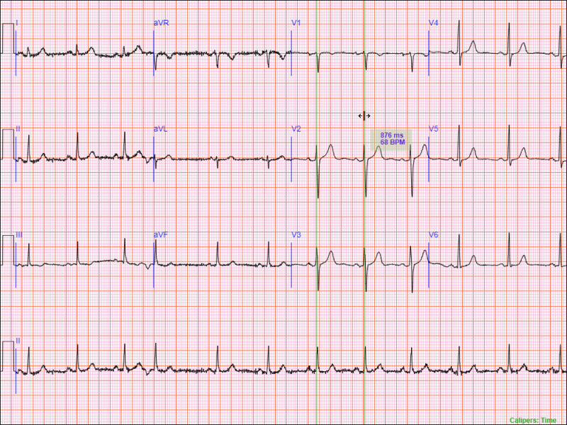 You can move a Time Caliper Measurement around the ECG in the Analysis Window. For example, if you want to check if the RR interval between the third and fourth normal QRS complexes in the image below is the same as the first RR interval, you can move the Time Caliper Measurement by placing the mouse cursor between the two measurement lines. The mouse cursor will change to to indicate you can move the measurement. Then click and hold the left mouse button and then move the mouse to the desired new location. You can also move the Time Caliper using the keyboard.