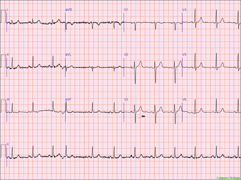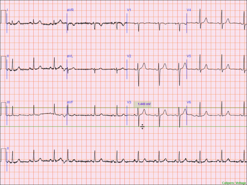 Fig. 7: In this image, the voltage caliper has been used to measure the amplitude of the 1st QRS complex in Lead V3. Note the measurement window above the caliper region that displays the amplitude in millivolts.