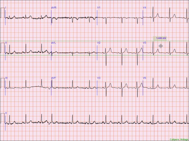 Fig. 5: In this image, the caliper interval shown in Figure 4 has been moved to measure the RR interval between the first 2 QRS complexes in Lead V5. Notice how the icon changes to .