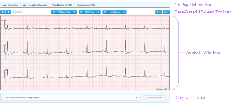 This page provides an overview of the user interface (UI) for 6-second and 10-second short telemetry ECGs. The image highlights key regions of the interface on the right. For more detailed information about these regions, visit the links below the image.